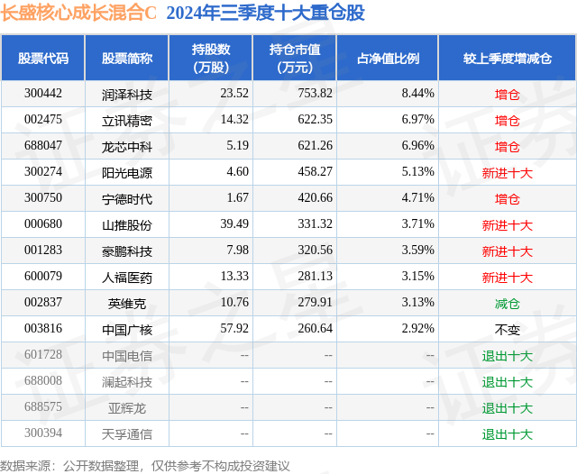 从基金规模来看,长盛核心成长混合C基金2024年三季度公布的基金规模为0.04亿元,较上一期规模368.79万元变化了26.7万元,环比变化了7.24%。该基金最新一期资产配置为:股票占净值比87.86%,无债券类资产,现金占净值比13.03%。从基金持仓来看,该基金当季前十大股票仓位达48.71%,第一大重仓股为润泽科技(300442),持仓占比为8.44%。