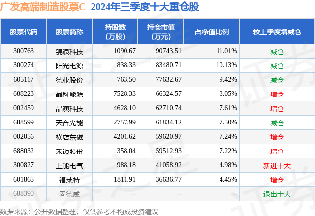 从基金规模来看,广发高端制造股票C基金2024年三季度公布的基金规模为15.09亿元,较上一期规模11.84亿元变化了3.24亿元,环比变化了27.4%。该基金最新一期资产配置为:股票占净值比93.59%,债券占净值比4.83%,现金占净值比2.23%。从基金持仓来看,该基金当季前十大股票仓位达77.61%,第一大重仓股为锦浪科技(300763),持仓占比为11.01%。