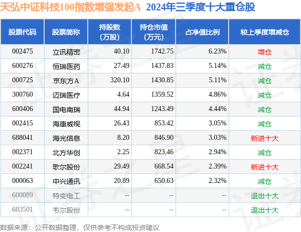 从基金规模来看,天弘中证科技100指数增强A基金2024年三季度公布的基金规模为1.01亿元,较上一期规模8145.85万元变化了2002.98万元,环比变化了24.59%。该基金最新一期资产配置为:股票占净值比94.81%,无债券类资产,现金占净值比5.07%。从基金持仓来看,该基金当季前十大股票仓位达39.51%,第一大重仓股为立讯精密(002475),持仓占比为6.23%。