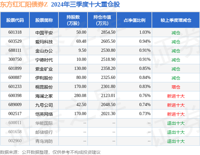 从基金规模来看,东方红汇阳债券Z基金2024年三季度公布的基金规模为0.21亿元,较上一期规模2131.81万元变化了-66.76万元,环比变化了-3.13%。该基金最新一期资产配置为:股票占净值比19.44%,债券占净值比83.78%,现金占净值比2.81%。从基金持仓来看,该基金当季前十大股票仓位达8.54%,第一大重仓股为中国平安(601318),持仓占比为1.03%。