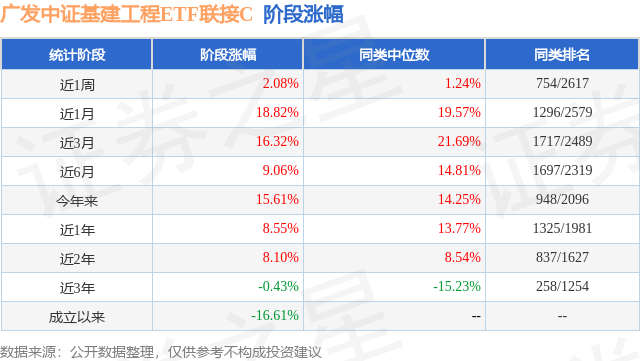 从业绩表现来看,广发中证基建工程ETF联接C基金过去一年净值涨幅为8.55%,在同类基金中排名1325/1981,同类基金过去一年净值涨幅中位数为13.77%。而基金过去一年的最大回撤为-20.32%,成立以来的最大回撤为-36.87%。