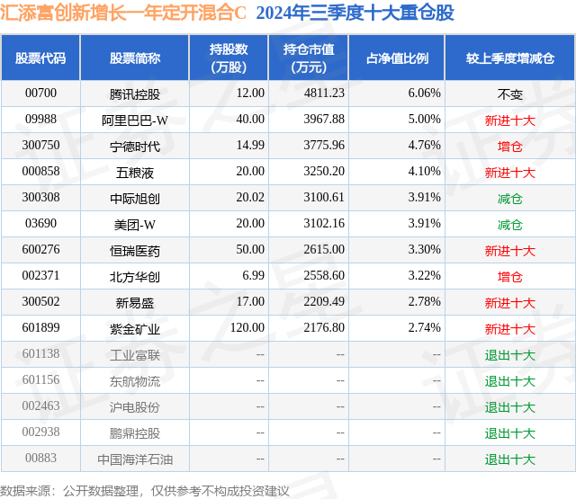 证券之星消息,日前汇添富创新增长一年定开混合C基金公布三季报,2024年三季度最新规模0.88亿元,季度净值涨幅为11.03%。
