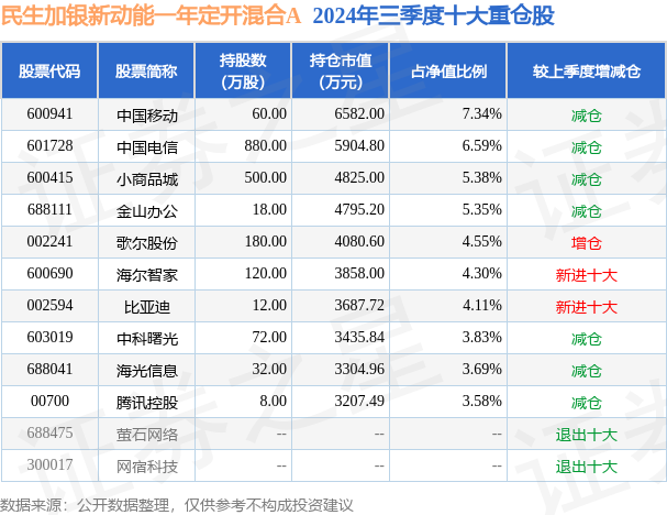 从基金规模来看,民生加银新动能一年定开混合A基金2024年三季度公布的基金规模为6.57亿元,较上一期规模6.77亿元变化了-1976.76万元,环比变化了-2.92%。该基金最新一期资产配置为:股票占净值比73.75%,无债券类资产,现金占净值比24.37%。从基金持仓来看,该基金当季前十大股票仓位达48.72%,第一大重仓股为中国移动(600941),持仓占比为7.34%。