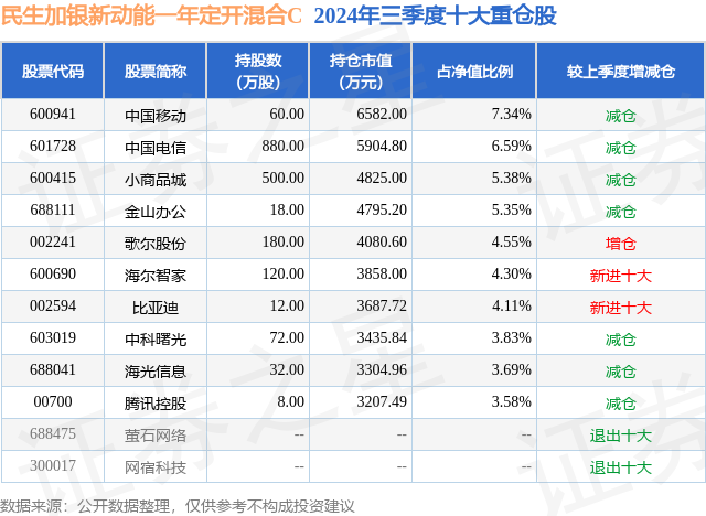 从基金规模来看,民生加银新动能一年定开混合C基金2024年三季度公布的基金规模为2.39亿元,较上一期规模2.57亿元变化了-1740.26万元,环比变化了-6.78%。该基金最新一期资产配置为:股票占净值比73.75%,无债券类资产,现金占净值比24.37%。从基金持仓来看,该基金当季前十大股票仓位达48.72%,第一大重仓股为中国移动(600941),持仓占比为7.34%。