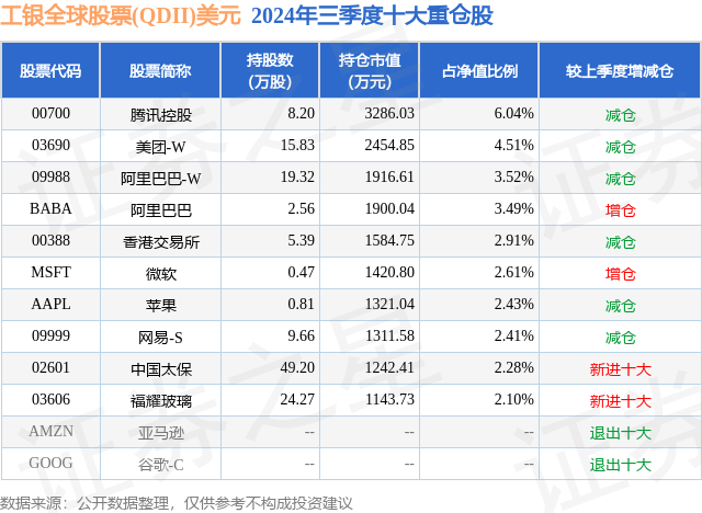 从基金规模来看,工银全球股票(QDII)美元基金2024年三季度公布的基金规模为5.44亿元,较上一期规模5.27亿元变化了1666.68万元,环比变化了3.16%。该基金最新一期资产配置为:股票占净值比83.08%,无债券类资产,现金占净值比8.29%。从基金持仓来看,该基金当季前十大股票仓位达32.3%,第一大重仓股为腾讯控股(00700),持仓占比为6.04%。