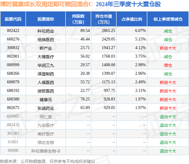 从基金规模来看,博时健康成长双周定期可赎回混合C基金2024年三季度公布的基金规模为0.75亿元,较上一期规模6904.22万元变化了556.44万元,环比变化了8.06%。该基金最新一期资产配置为:股票占净值比90.05%,债券占净值比0.11%,现金占净值比10.91%。从基金持仓来看,该基金当季前十大股票仓位达33.57%,第一大重仓股为科伦药业(002422),持仓占比为6.07%。