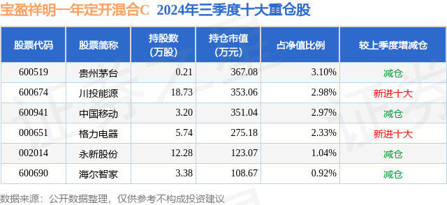 从基金规模来看,宝盈祥明一年定开混合C基金2024年三季度公布的基金规模为0.02亿元,较上一期规模274.02万元变化了-87.99万元,环比变化了-32.11%。该基金最新一期资产配置为:股票占净值比13.34%,债券占净值比122.66%,现金占净值比2.32%。从基金持仓来看,该基金当季前十大股票仓位达13.34%,第一大重仓股为贵州茅台(600519),持仓占比为3.1%。