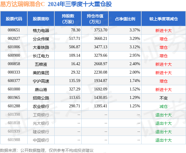 从基金规模来看,易方达瑞锦混合C基金2024年三季度公布的基金规模为5.58亿元,较上一期规模3.98亿元变化了1.6亿元,环比变化了40.18%。该基金最新一期资产配置为:股票占净值比45.89%,债券占净值比85.19%,现金占净值比1.44%。从基金持仓来看,该基金当季前十大股票仓位达22.93%,第一大重仓股为格力电器(000651),持仓占比为3.37%。