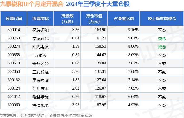 从基金规模来看,九泰锐和18个月定开混合基金2024年三季度公布的基金规模为0.18亿元,较上一期规模1499.99万元变化了288.35万元,环比变化了19.22%。该基金最新一期资产配置为:股票占净值比86.68%,无债券类资产,现金占净值比13.63%。从基金持仓来看,该基金当季前十大股票仓位达76.37%,第一大重仓股为亿纬锂能(300014),持仓占比为9.16%。