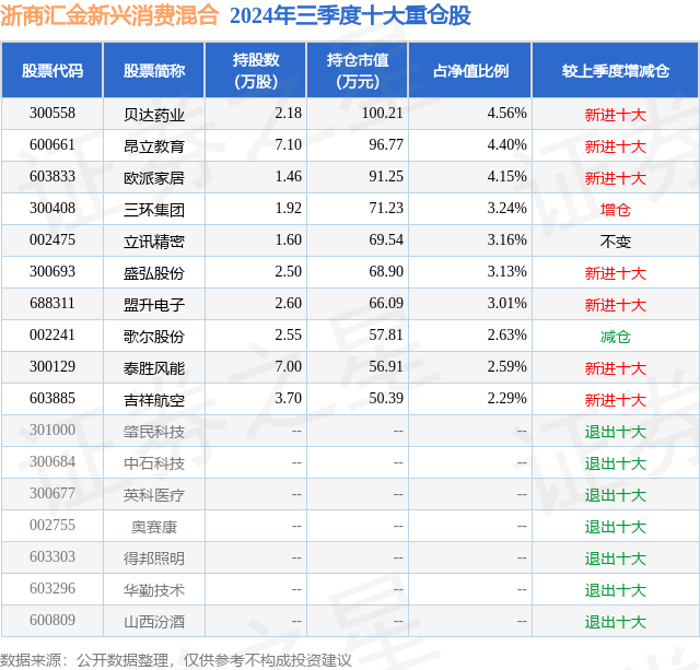 从基金规模来看,浙商汇金新兴消费混合基金2024年三季度公布的基金规模为0.22亿元,较上一期规模1939.26万元变化了259.12万元,环比变化了13.36%。该基金最新一期资产配置为:股票占净值比92.48%,无债券类资产,现金占净值比9.12%。从基金持仓来看,该基金当季前十大股票仓位达33.16%,第一大重仓股为贝达药业(300558),持仓占比为4.56%。