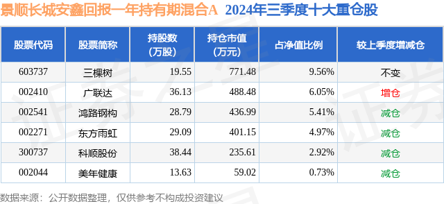 从基金规模来看,景顺长城安鑫回报一年持有期混合A基金2024年三季度公布的基金规模为0.73亿元,较上一期规模8725.61万元变化了-1474.99万元,环比变化了-16.9%。该基金最新一期资产配置为:股票占净值比29.64%,债券占净值比91.15%,现金占净值比2.12%。从基金持仓来看,该基金当季前十大股票仓位达29.64%,第一大重仓股为三棵树(603737),持仓占比为9.56%。
