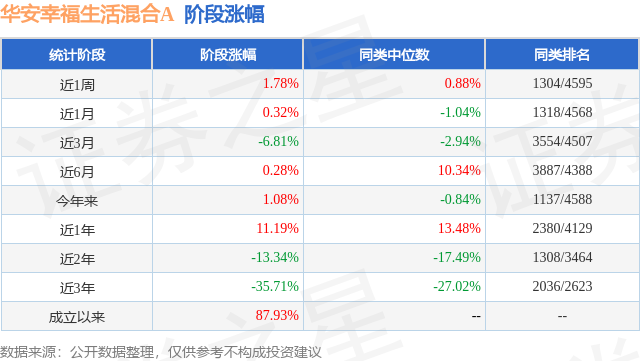 从业绩表现来看,华安幸福生活混合A基金过去一年净值涨幅为12.76%,在同类基金中排名825/3979,同类基金过去一年净值涨幅中位数为5.4%。而基金过去一年的最大回撤为-16.84%,成立以来的最大回撤为-57.07%。
