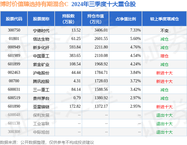 从基金规模来看,博时价值臻选持有期混合C基金2024年三季度公布的基金规模为0.29亿元,较上一期规模2703.42万元变化了183.71万元,环比变化了6.8%。该基金最新一期资产配置为:股票占净值比88.97%,债券占净值比0.31%,现金占净值比12.3%。从基金持仓来看,该基金当季前十大股票仓位达43.37%,第一大重仓股为宁德时代(300750),持仓占比为7.33%。