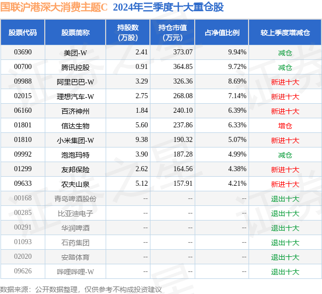 从基金规模来看,国联沪港深大消费主题C基金2024年三季度公布的基金规模为0.26亿元,较上一期规模1834.08万元变化了719.89万元,环比变化了39.25%。该基金最新一期资产配置为:股票占净值比87.67%,无债券类资产,现金占净值比12.76%。从基金持仓来看,该基金当季前十大股票仓位达66.86%,第一大重仓股为美团-W(03690),持仓占比为9.94%。