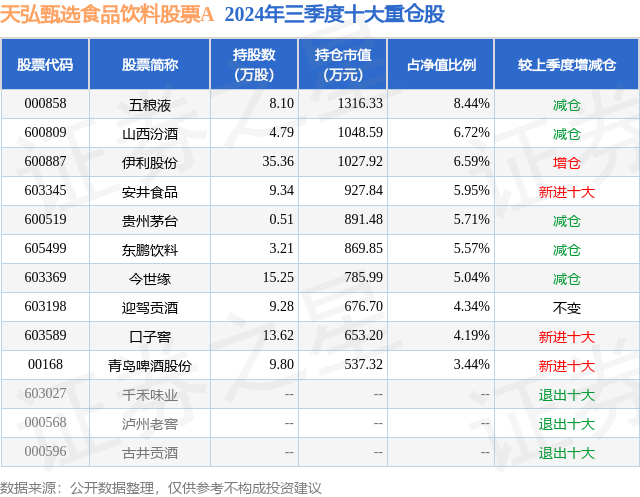 从基金规模来看,天弘甄选食品饮料股票A基金2024年三季度公布的基金规模为0.73亿元,较上一期规模6618.14万元变化了676.1万元,环比变化了10.22%。该基金最新一期资产配置为:股票占净值比86.99%,无债券类资产,现金占净值比16.92%。从基金持仓来看,该基金当季前十大股票仓位达55.99%,第一大重仓股为五粮液(000858),持仓占比为8.44%。