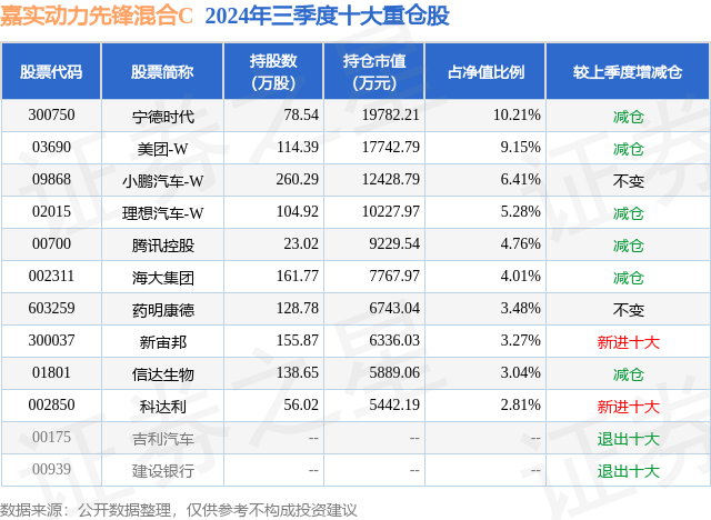 从基金规模来看,嘉实动力先锋混合C基金2024年三季度公布的基金规模为1.95亿元,较上一期规模1.58亿元变化了3650.1万元,环比变化了23.03%。该基金最新一期资产配置为:股票占净值比90.58%,无债券类资产,现金占净值比5.62%。从基金持仓来看,该基金当季前十大股票仓位达52.42%,第一大重仓股为宁德时代(300750),持仓占比为10.21%。