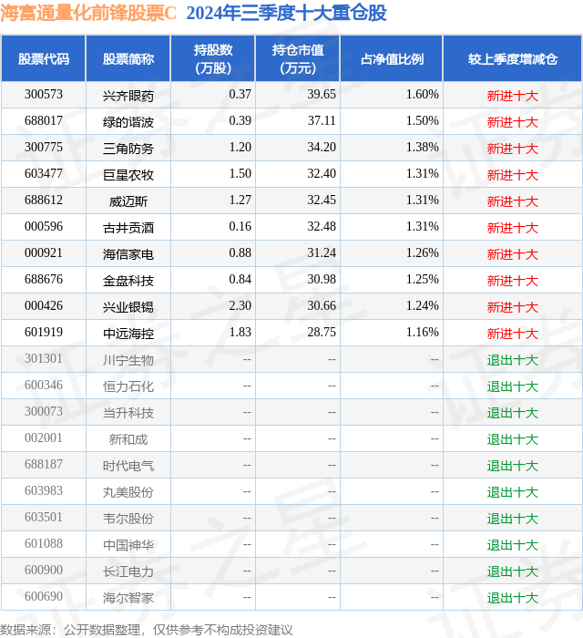 从基金规模来看,海富通量化前锋股票C基金2024年三季度公布的基金规模为0.22亿元,较上一期规模3280.12万元变化了-1123.49万元,环比变化了-34.25%。该基金最新一期资产配置为:股票占净值比88.18%,债券占净值比3.65%,现金占净值比5.51%。从基金持仓来看,该基金当季前十大股票仓位达13.32%,第一大重仓股为兴齐眼药(300573),持仓占比为1.6%。