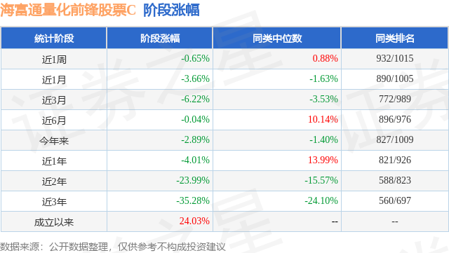 从业绩表现来看,海富通量化前锋股票C基金过去一年净值涨幅为-7.86%,在同类基金中排名807/897,同类基金过去一年净值涨幅中位数为6.57%。而基金过去一年的最大回撤为-32.38%,成立以来的最大回撤为-47.3%。