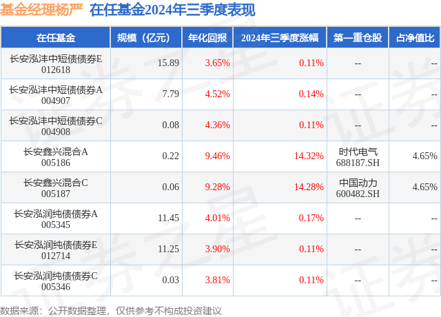 长安鑫兴混合C现任基金经理为杨严 张云凯。其中在任基金经理杨严已从业4年又63天,2023年4月28日正式接手管理长安鑫兴混合C,任职期间累计回报为23.2%。目前还管理着8只基金产品(包括A类和C类),其中本季度表现最佳的基金为长安鑫兴混合A(005186),季度净值涨幅为14.32%。