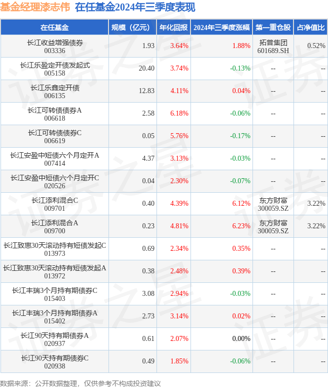 长江添利混合C现任基金经理为漆志伟 徐婕。其中在任基金经理漆志伟已从业8年又12天,2020年8月6日正式接手管理长江添利混合C,任职期间累计回报为19.89%。目前还管理着15只基金产品(包括A类和C类),其中本季度表现最佳的基金为长江添利混合A(009700),季度净值涨幅为6.23%。