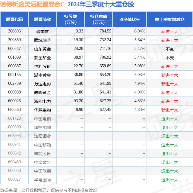 从基金规模来看,诺德新盛灵活配置混合C基金2024年三季度公布的基金规模为1.26亿元,较上一期规模1.2亿元变化了526.81万元,环比变化了4.38%。该基金最新一期资产配置为:股票占净值比85.19%,无债券类资产,现金占净值比11.35%。从基金持仓来看,该基金当季前十大股票仓位达52.24%,第一大重仓股为爱美客(300896),持仓占比为6.04%。