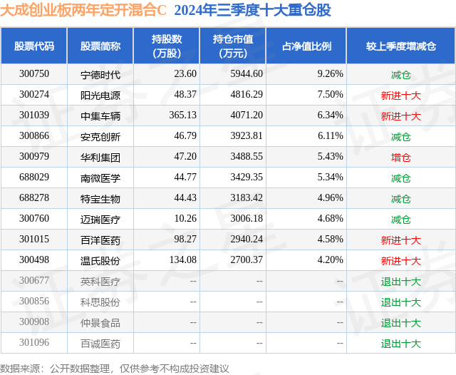 从基金规模来看,大成创业板两年定开混合C基金2024年三季度公布的基金规模为1.59亿元,较上一期规模1.99亿元变化了-3978.2万元,环比变化了-19.99%。该基金最新一期资产配置为:股票占净值比88.47%,无债券类资产,现金占净值比10.25%。从基金持仓来看,该基金当季前十大股票仓位达58.4%,第一大重仓股为宁德时代(300750),持仓占比为9.26%。