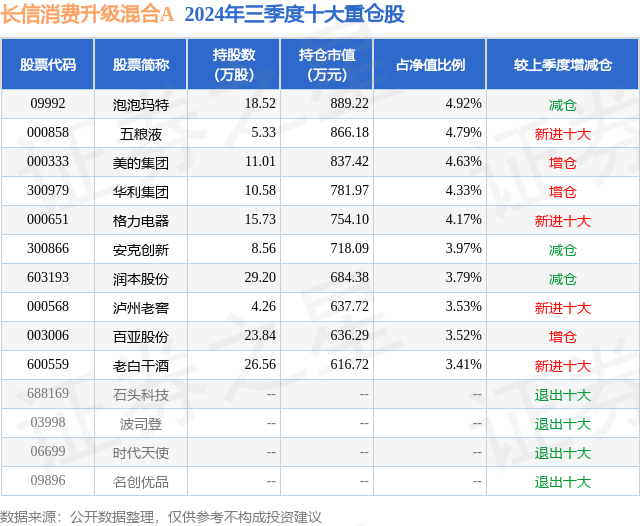 从基金规模来看,长信消费升级混合A基金2024年三季度公布的基金规模为1.28亿元,较上一期规模1.17亿元变化了1161.69万元,环比变化了9.96%。该基金最新一期资产配置为:股票占净值比83.67%,无债券类资产,现金占净值比17.71%。从基金持仓来看,该基金当季前十大股票仓位达41.06%,第一大重仓股为泡泡玛特(09992),持仓占比为4.92%。