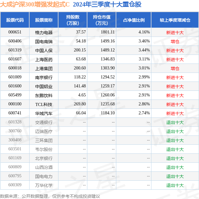 从基金规模来看,大成沪深300增强发起式C基金2024年三季度公布的基金规模为3.04亿元,较上一期规模2.14亿元变化了9010.4万元,环比变化了42.12%。该基金最新一期资产配置为:股票占净值比92.54%,无债券类资产,现金占净值比8.53%。从基金持仓来看,该基金当季前十大股票仓位达31.59%,第一大重仓股为格力电器(000651),持仓占比为4.16%。