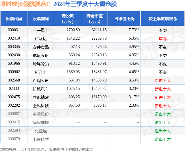 从基金规模来看,博时成长领航混合C基金2024年三季度公布的基金规模为5.19亿元,较上一期规模4.59亿元变化了5978.63万元,环比变化了13.01%。该基金最新一期资产配置为:股票占净值比86.11%,债券占净值比0.52%,现金占净值比7.84%。从基金持仓来看,该基金当季前十大股票仓位达44.15%,第一大重仓股为三一重工(600031),持仓占比为7.73%。