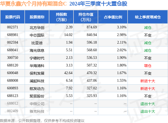 从基金规模来看,华夏永鑫六个月持有期混合C基金2024年三季度公布的基金规模为0.13亿元,较上一期规模1267.41万元变化了30.23万元,环比变化了2.39%。该基金最新一期资产配置为:股票占净值比35.59%,债券占净值比80.98%,现金占净值比1.84%。从基金持仓来看,该基金当季前十大股票仓位达19.45%,第一大重仓股为北方华创(002371),持仓占比为3.1%。