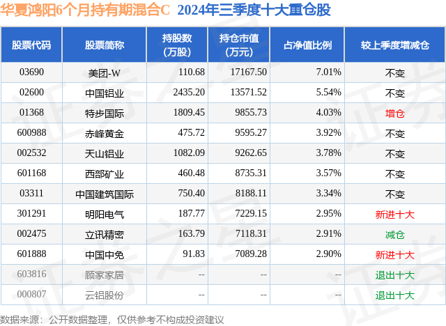 从基金规模来看,华夏鸿阳6个月持有期混合C基金2024年三季度公布的基金规模为2.78亿元,较上一期规模2.61亿元变化了1697.03万元,环比变化了6.49%。该基金最新一期资产配置为:股票占净值比90.92%,无债券类资产,现金占净值比14.3%。从基金持仓来看,该基金当季前十大股票仓位达39.95%,第一大重仓股为美团-W(03690),持仓占比为7.01%。
