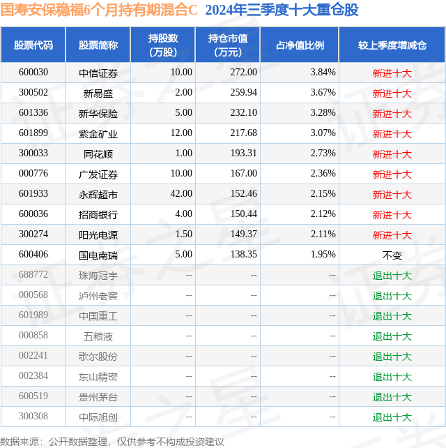 从基金规模来看,国寿安保稳福6个月持有期混合C基金2024年三季度公布的基金规模为0.12亿元,较上一期规模1094.3万元变化了62.41万元,环比变化了5.7%。该基金最新一期资产配置为:股票占净值比28.72%,债券占净值比78.45%,现金占净值比4.82%。从基金持仓来看,该基金当季前十大股票仓位达27.28%,第一大重仓股为中信证券(600030),持仓占比为3.84%。