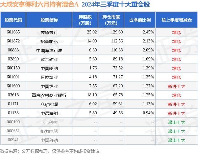 从基金规模来看,大成安享得利六月持有混合A基金2024年三季度公布的基金规模为0.32亿元,较上一期规模3321.27万元变化了-138.52万元,环比变化了-4.17%。该基金最新一期资产配置为:股票占净值比31.09%,债券占净值比62.55%,现金占净值比6.89%。从基金持仓来看,该基金当季前十大股票仓位达15.69%,第一大重仓股为齐鲁银行(601665),持仓占比为2.45%。