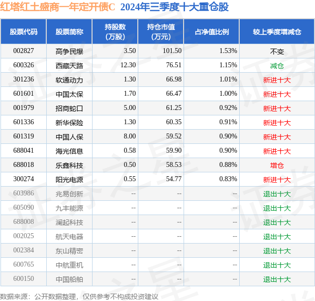 从基金规模来看,红塔红土盛商一年定开债C基金2024年三季度公布的基金规模为0.02亿元,较上一期规模160.64万元变化了3.36万元,环比变化了2.09%。该基金最新一期资产配置为:股票占净值比11.66%,债券占净值比81.48%,现金占净值比1.82%。从基金持仓来看,该基金当季前十大股票仓位达10.03%,第一大重仓股为高争民爆(002827),持仓占比为1.53%。