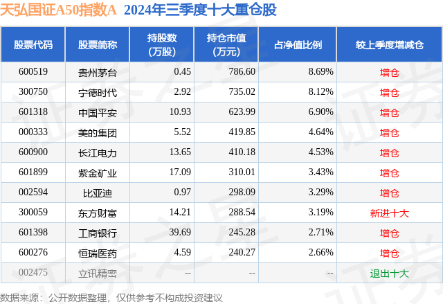 从基金规模来看,天弘国证A50指数A基金2024年三季度公布的基金规模为0.29亿元,较上一期规模2296.26万元变化了566.19万元,环比变化了24.66%。该基金最新一期资产配置为:股票占净值比94.52%,无债券类资产,现金占净值比5.1%。从基金持仓来看,该基金当季前十大股票仓位达48.16%,第一大重仓股为贵州茅台(600519),持仓占比为8.69%。