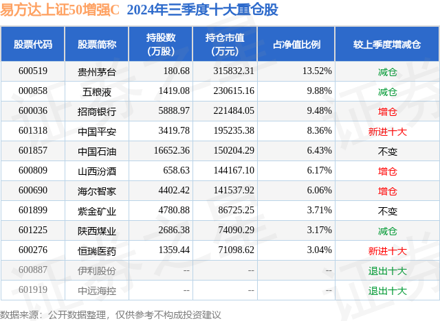 从基金规模来看,易方达上证50增强C基金2024年三季度公布的基金规模为29.96亿元,较上一期规模25.94亿元变化了4.03亿元,环比变化了15.53%。该基金最新一期资产配置为:股票占净值比91.85%,无债券类资产,现金占净值比7.39%。从基金持仓来看,该基金当季前十大股票仓位达69.82%,第一大重仓股为贵州茅台(600519),持仓占比为13.52%。