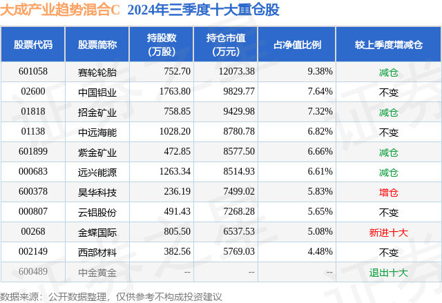 从基金规模来看,大成产业趋势混合C基金2024年三季度公布的基金规模为3.46亿元,较上一期规模3.44亿元变化了193.31万元,环比变化了0.56%。该基金最新一期资产配置为:股票占净值比91.37%,无债券类资产,现金占净值比7.8%。从基金持仓来看,该基金当季前十大股票仓位达65.47%,第一大重仓股为赛轮轮胎(601058),持仓占比为9.38%。
