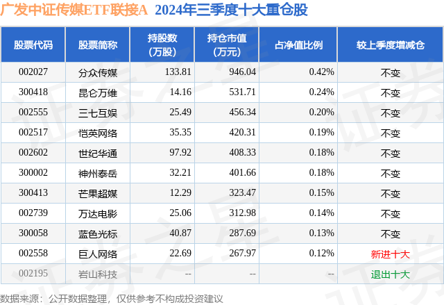 证券之星消息,日前广发中证传媒ETF联接A基金公布三季报,2024年三季度最新规模7.73亿元,季度净值涨幅为20.13%。