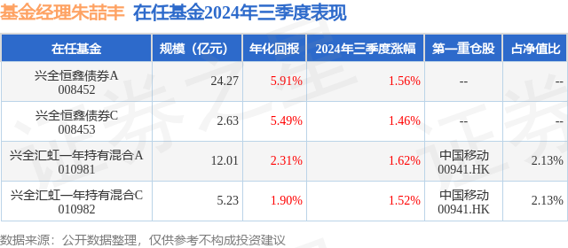 从基金规模来看,兴全汇虹一年持有混合A基金2024年三季度公布的基金规模为12.01亿元,较上一期规模12.56亿元变化了-5427.6万元,环比变化了-4.32%。该基金最新一期资产配置为:股票占净值比22.45%,债券占净值比82.93%,现金占净值比1.84%。从基金持仓来看,该基金当季前十大股票仓位达13.72%,第一大重仓股为中国移动(00941),持仓占比为2.13%。