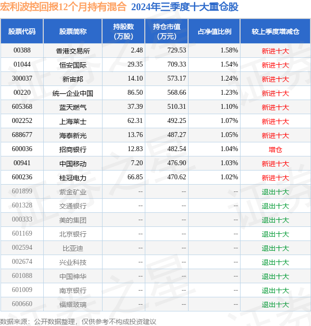 从基金规模来看,宏利波控回报12个月持有混合基金2024年三季度公布的基金规模为4.62亿元,较上一期规模4.84亿元变化了-2204.81万元,环比变化了-4.56%。该基金最新一期资产配置为:股票占净值比29.67%,债券占净值比80.66%,现金占净值比7.56%。从基金持仓来看,该基金当季前十大股票仓位达11.9%,第一大重仓股为香港交易所(00388),持仓占比为1.58%。