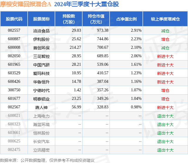 从基金规模来看,摩根安隆回报混合A基金2024年三季度公布的基金规模为1.89亿元,较上一期规模1.99亿元变化了-1015.91万元,环比变化了-5.1%。该基金最新一期资产配置为:股票占净值比23.11%,债券占净值比34.98%,现金占净值比2.1%。从基金持仓来看,该基金当季前十大股票仓位达16.39%,第一大重仓股为洽洽食品(002557),持仓占比为2.91%。