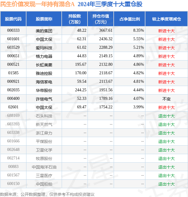 从基金规模来看,民生价值发现一年持有混合A基金2024年三季度公布的基金规模为4.1亿元,较上一期规模3.94亿元变化了1602.67万元,环比变化了4.07%。该基金最新一期资产配置为:股票占净值比91.79%,无债券类资产,现金占净值比10.2%。从基金持仓来看,该基金当季前十大股票仓位达50.99%,第一大重仓股为美的集团(000333),持仓占比为8.35%。