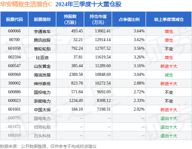 从基金规模来看,华安精致生活混合C基金2024年三季度公布的基金规模为12.34亿元,较上一期规模12.94亿元变化了-6053.47万元,环比变化了-4.68%。该基金最新一期资产配置为:股票占净值比86.01%,无债券类资产,现金占净值比14.13%。从基金持仓来看,该基金当季前十大股票仓位达30.23%,第一大重仓股为宇通客车(600066),持仓占比为3.64%。