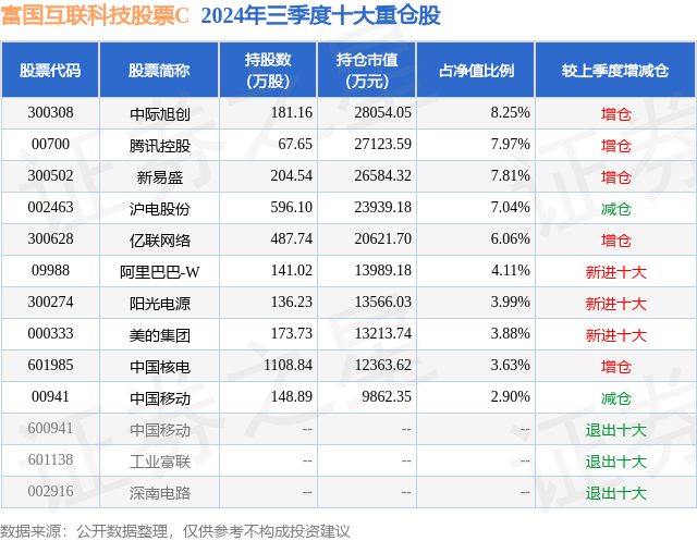 从基金规模来看,富国互联科技股票C基金2024年三季度公布的基金规模为5.65亿元,较上一期规模4.3亿元变化了1.36亿元,环比变化了31.62%。该基金最新一期资产配置为:股票占净值比86.42%,无债券类资产,现金占净值比12.22%。从基金持仓来看,该基金当季前十大股票仓位达55.64%,第一大重仓股为中际旭创(300308),持仓占比为8.25%。