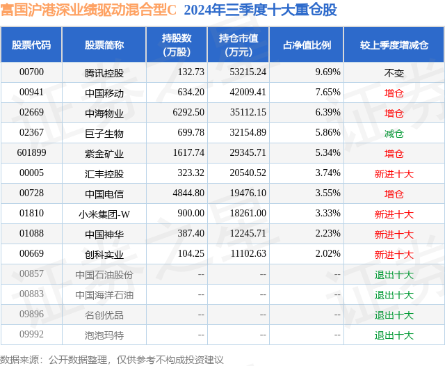 从基金规模来看,富国沪港深业绩驱动混合型C基金2024年三季度公布的基金规模为19.57亿元,较上一期规模18.22亿元变化了1.35亿元,环比变化了7.43%。该基金最新一期资产配置为:股票占净值比69.24%,债券占净值比0.03%,现金占净值比34.52%。从基金持仓来看,该基金当季前十大股票仓位达49.8%,第一大重仓股为腾讯控股(00700),持仓占比为9.69%。
