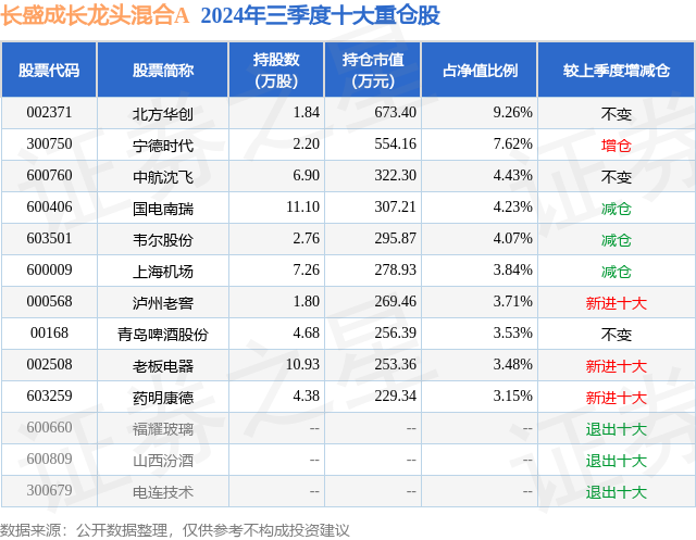 从基金规模来看,长盛成长龙头混合A基金2024年三季度公布的基金规模为0.71亿元,较上一期规模6326.95万元变化了801.8万元,环比变化了12.67%。该基金最新一期资产配置为:股票占净值比94.13%,无债券类资产,现金占净值比5.89%。从基金持仓来看,该基金当季前十大股票仓位达47.32%,第一大重仓股为北方华创(002371),持仓占比为9.26%。