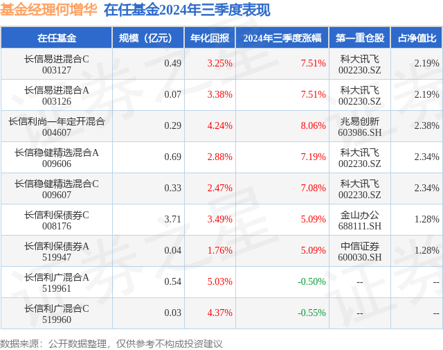 长信利尚一年定开混合现任基金经理为何增华。其中在任基金经理何增华已从业2年又44天,2022年12月8日正式接手管理长信利尚一年定开混合,任职期间累计回报为10.66%。目前还管理着9只基金产品(包括A类和C类),其中本季度表现最佳的基金为长信利尚一年定开混合(004607),季度净值涨幅为8.06%。