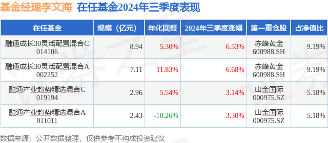 融通产业趋势精选混合A现任基金经理为李文海。其中在任基金经理李文海已从业1年又172天,2023年5月9日正式接手管理融通产业趋势精选混合A,任职期间累计回报为1.95%。目前还管理着4只基金产品(包括A类和C类),其中本季度表现最佳的基金为融通成长30灵活配置混合A(002252),季度净值涨幅为6.68%。
