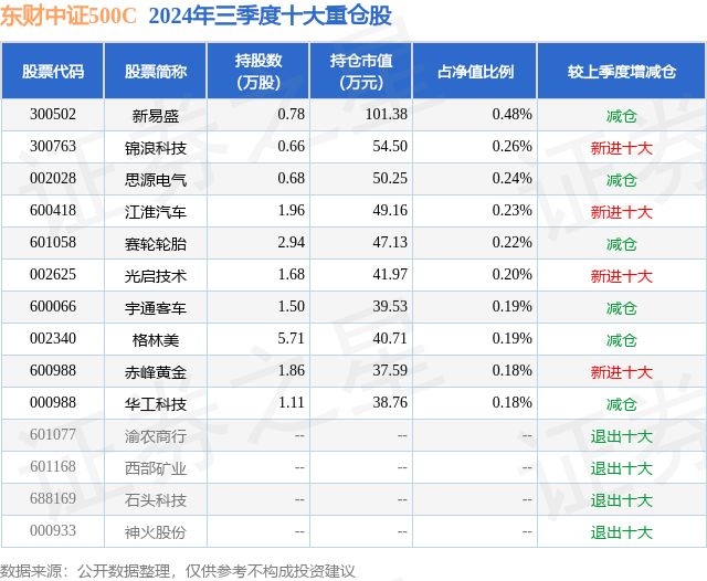 从基金规模来看,东财中证500C基金2024年三季度公布的基金规模为0.59亿元,较上一期规模6340.3万元变化了-438.14万元,环比变化了-6.91%。该基金最新一期资产配置为:股票占净值比36.37%,无债券类资产,现金占净值比5.49%。从基金持仓来看,该基金当季前十大股票仓位达2.37%,第一大重仓股为新易盛(300502),持仓占比为0.48%。