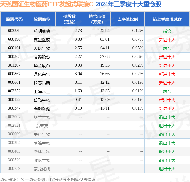 从基金规模来看,天弘国证生物医药ETF发起式联接C基金2024年三季度公布的基金规模为10.15亿元,较上一期规模8.64亿元变化了1.51亿元,环比变化了17.48%。该基金最新一期资产配置为:股票占净值比0.41%,债券占净值比0.47%,现金占净值比4.84%。从基金持仓来看,该基金当季前十大股票仓位达0.35%,第一大重仓股为药明康德(603259),持仓占比为0.12%。